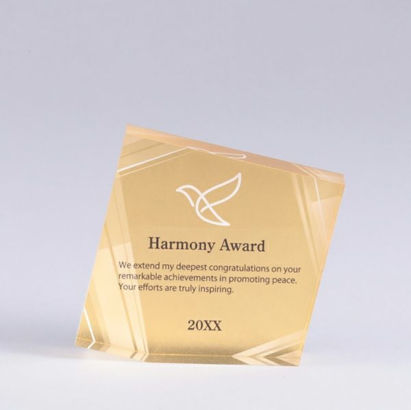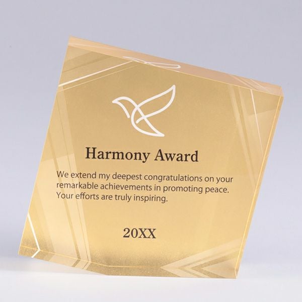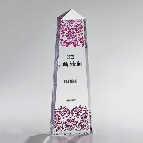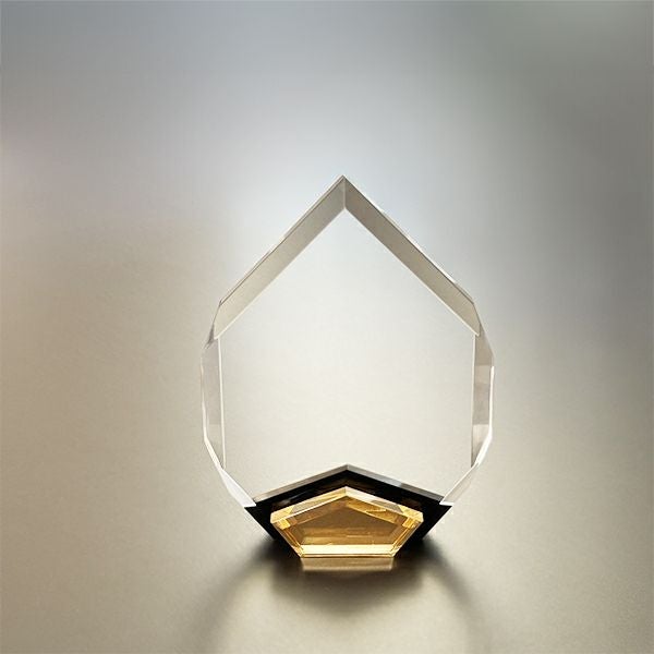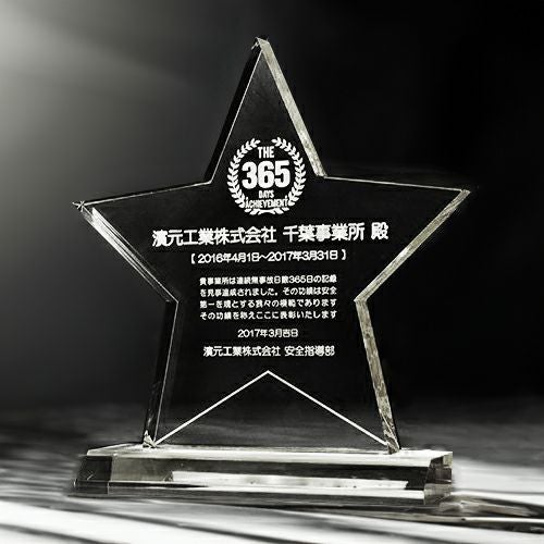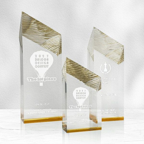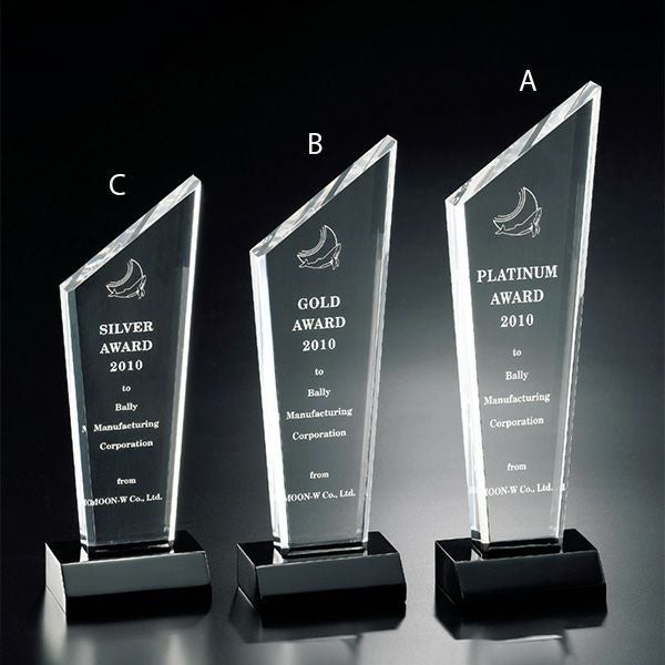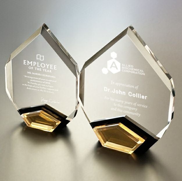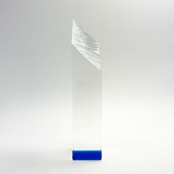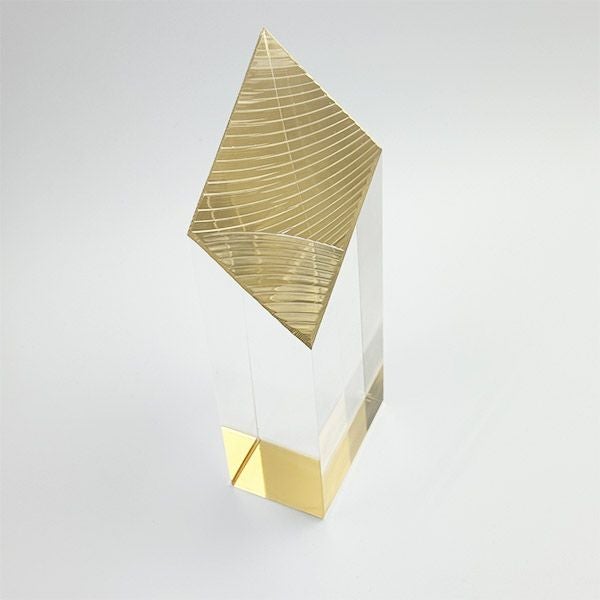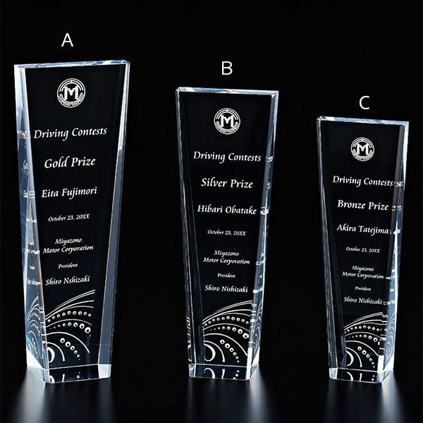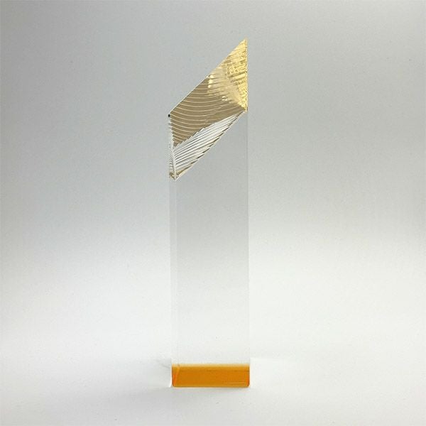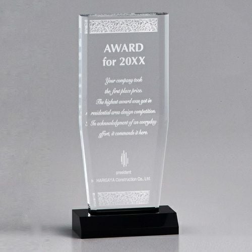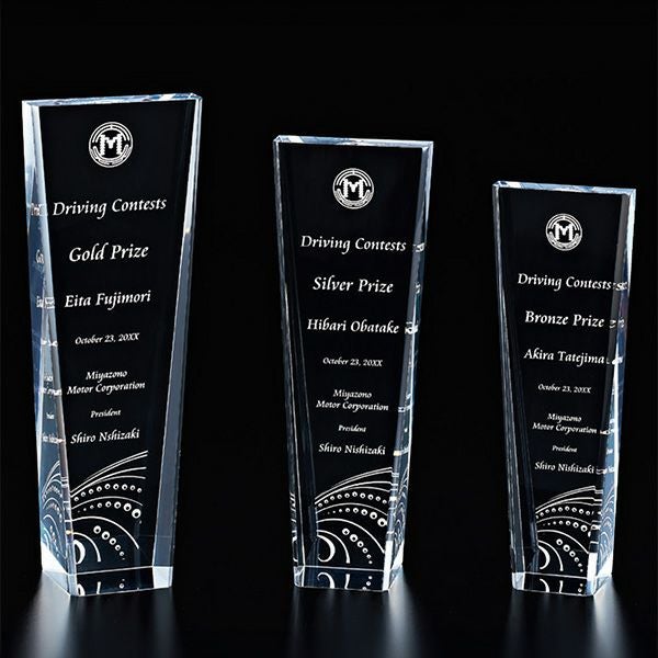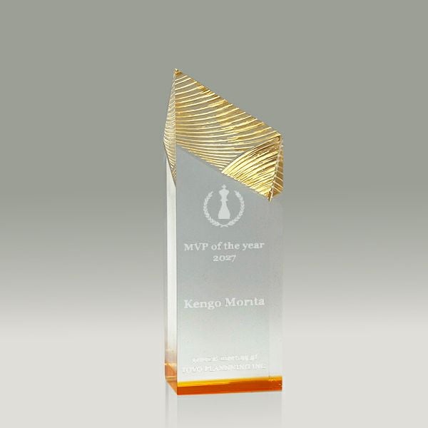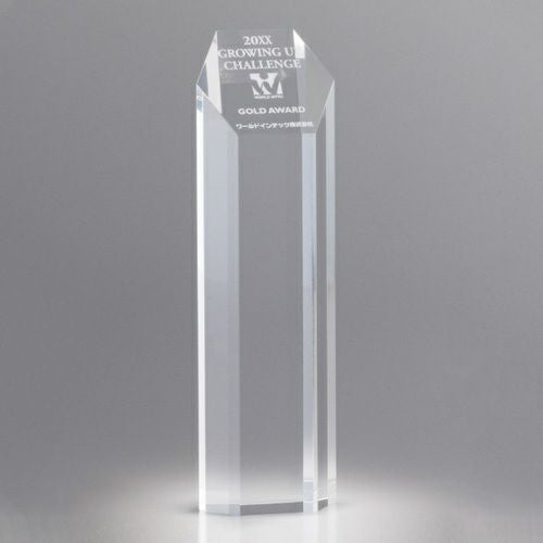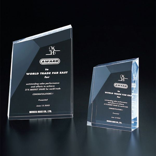 表彰の本場・アメリカから輸入するユニークな形状のアクリルトロフィー。文字のレーザー彫刻加工は当店で行います。レーザー彫刻で細かいオリジナルデザインや企業ロゴマーク、イベントロゴや名前の彫刻も可能。デザイン料無料&デザインデータ保管でリピート購入もしやすく、社内表彰用に人気。透明度が高く高級感がありどんな表彰シーンにもご利用できます。「もらってうれしい、飾れば映える」トロフィーの定番です。