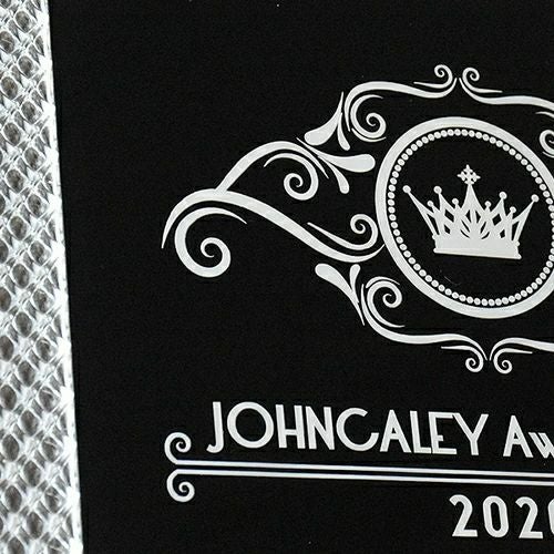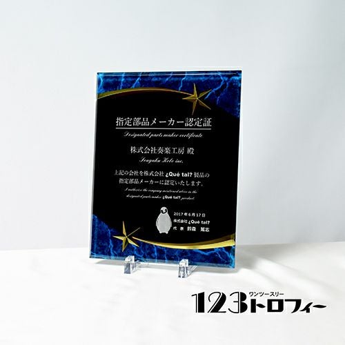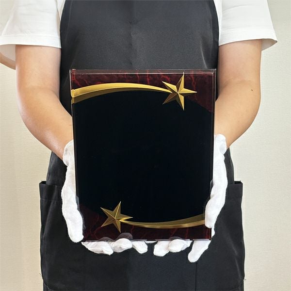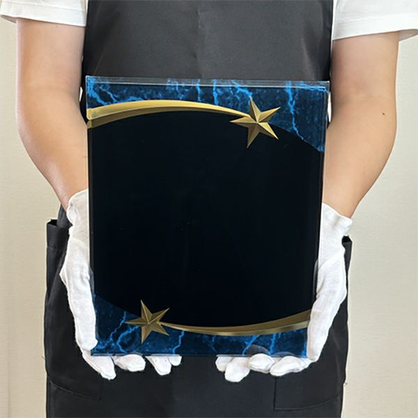 ほかのトロフィーや表彰楯同様、デザイン料無料でご希望の記念品を制作できます。彫刻面が広く多くの文字を彫刻できるほか、イラストやロゴなども再現可能です。アクリルに裏側からレーザー彫刻を施すため彫刻した部分が白色で表現され、洗練されたイメージの商品を制作できます。また、「デザインは苦手…」という方も、デザイン作成は安心して当店のデザイナーにお任せください。