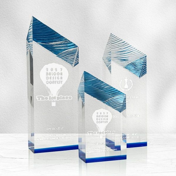 (サムズアップ)や星型、斜めのカットが美しい商品や楯状の商品、複雑な模様が施された商品や一部にゴールドやブルーのカラーを取り入れた商品など、デザイン性が高いところが輸入トロフィーの魅力です。種類豊富な取扱商品の中からイメージに合った商品をお選びいただけます。