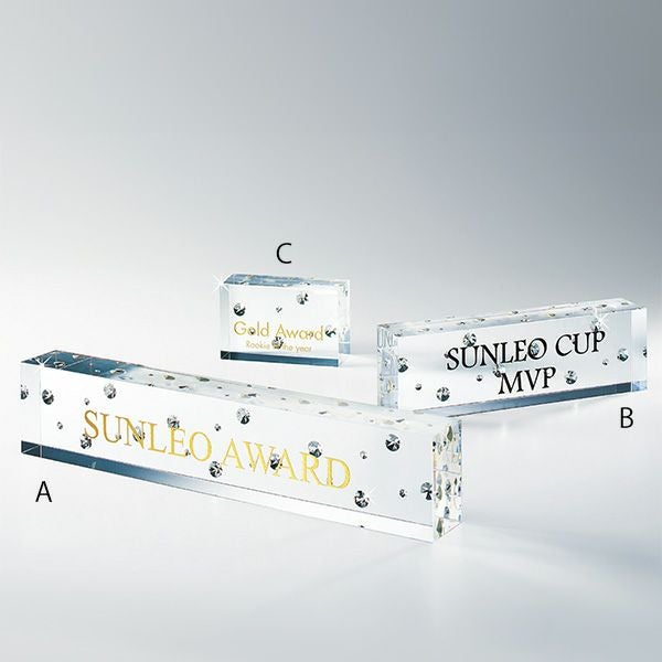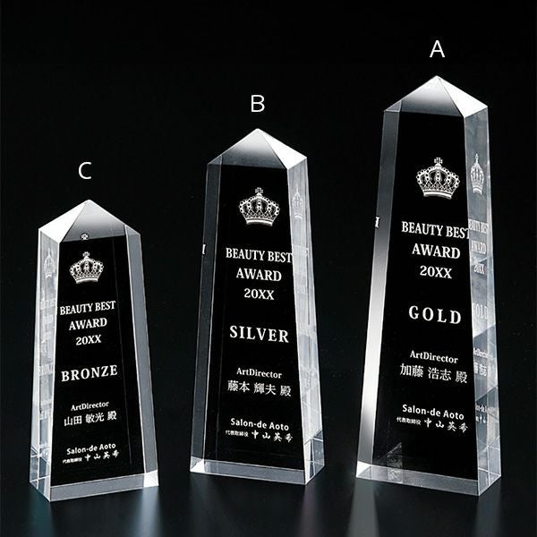 昨今のアワードの定番になりつつある、クリスタル(ガラス製)やアクリル製の透明なトロフィー。法人のお客様からも大人気の商品です。透明なので、光を反射してキラキラ輝く姿が美しく高級感を感じさせます。また、並べて棚に飾っていても上品さが漂い、透けていることで圧迫感を感じさせないのも魅力です。誰もがもらってうれしい、印象に残る華やかなトロフィーです。