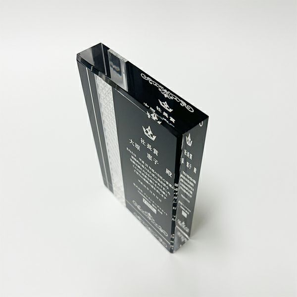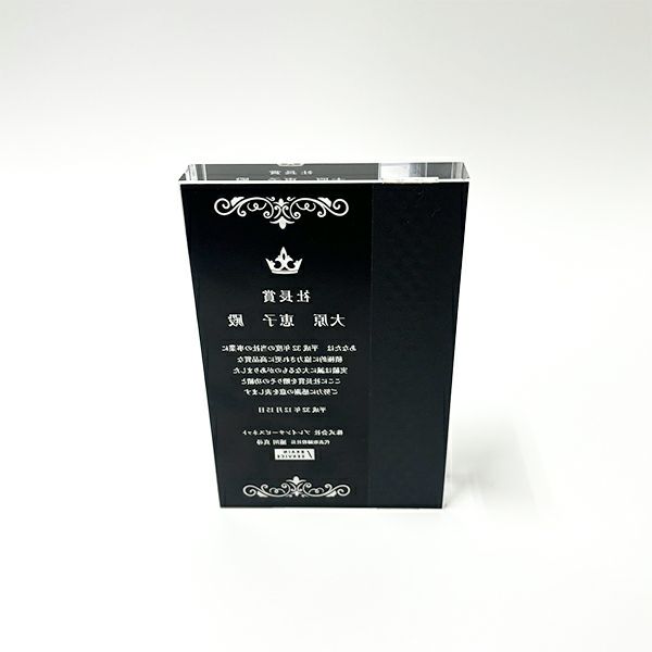 同じ透明なトロフィーとしてクリスタルトロフィー(ガラス製)も取り扱っておりますが、どうしても高価な商品が多いです。しかし、輸入トロフィーはアクリル製のため、比較的安価でお買い求めいただけます。とはいえ、その品質は確かで多くのお客様から喜びの声をいただいており、専用の貼箱に梱包してお届けさせていただいております(白手袋付き)。軽くて丈夫なハイクオリティな透明トロフィーを、ぜひ一度ご利用くださいませ。