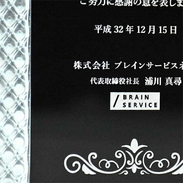 ほかのトロフィーや表彰楯同様、デザイン料無料でご希望の記念品を制作できます。彫刻面が広く多くの文字を彫刻できるほか、イラストやロゴなども再現可能です。アクリルに裏側からレーザー彫刻を施すため彫刻した部分が白色で表現され、洗練されたイメージの商品を制作できます。また、「デザインは苦手…」という方も、デザイン作成は安心して当店のデザイナーにお任せください。