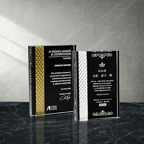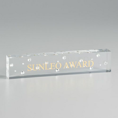 昨今のアワードの定番になりつつある、クリスタル(ガラス製)やアクリル製の透明なトロフィー。法人のお客様からも大人気の商品です。透明なので、光を反射してキラキラ輝く姿が美しく高級感を感じさせます。また、並べて棚に飾っていても上品さが漂い、透けていることで圧迫感を感じさせないのも魅力です。誰もがもらってうれしい、印象に残る華やかなトロフィーです。
