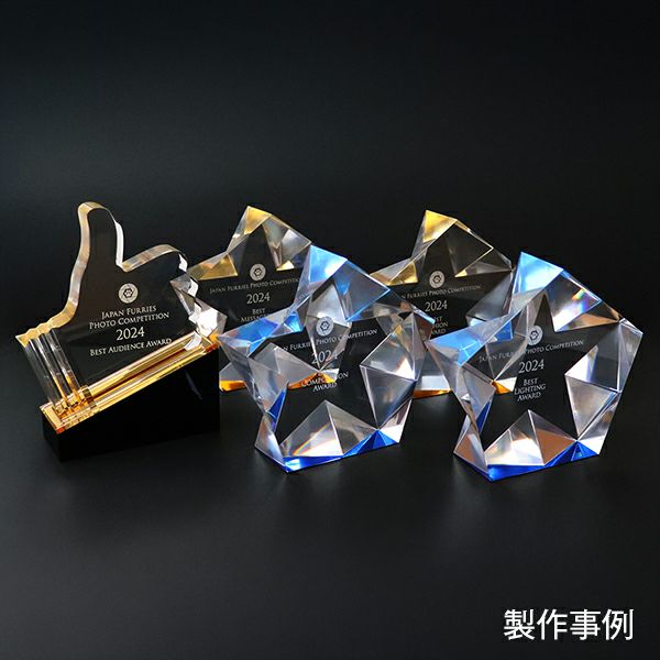 (サムズアップ)や星型、斜めのカットが美しい商品や楯状の商品、複雑な模様が施された商品や一部にゴールドやブルーのカラーを取り入れた商品など、デザイン性が高いところが輸入トロフィーの魅力です。種類豊富な取扱商品の中からイメージに合った商品をお選びいただけます。