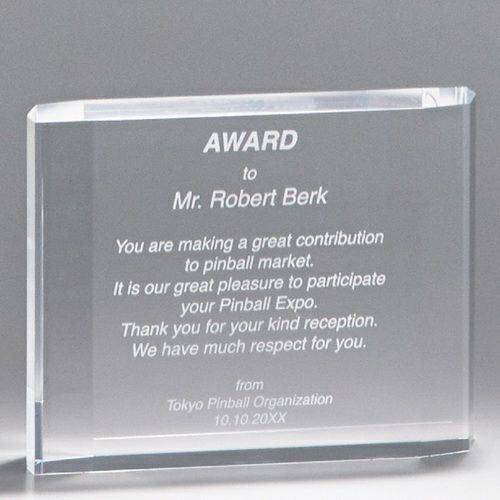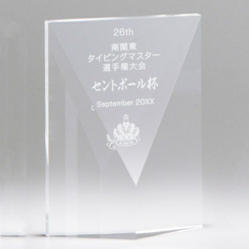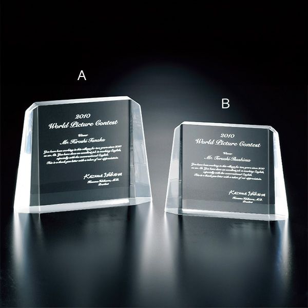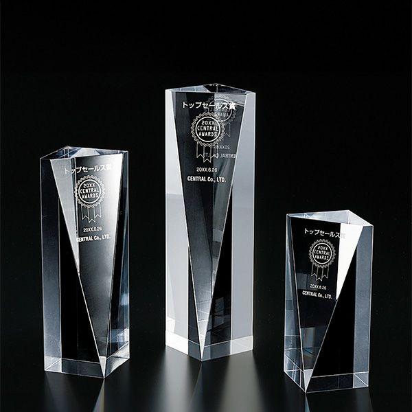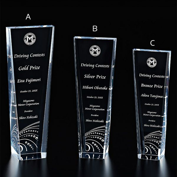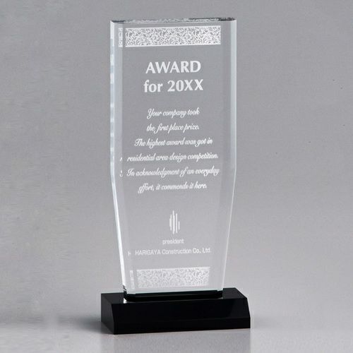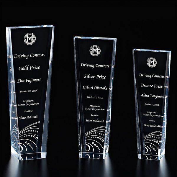 表彰の本場・アメリカから輸入するユニークな形状のアクリルトロフィー。セミオーダーメイド商品で、文字のレーザー彫刻加工は当店で行います。精密なレーザー彫刻で細かいオリジナルデザインや企業ロゴマーク、イベントロゴや名前の彫刻も可能。アクリル製のトロフィーはガラス製よりも軽くて割れにくく安価なため、当店の人気ナンバーワン商品です。