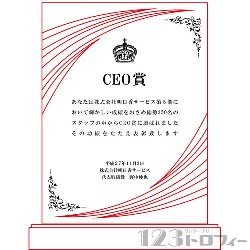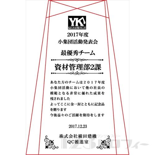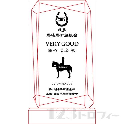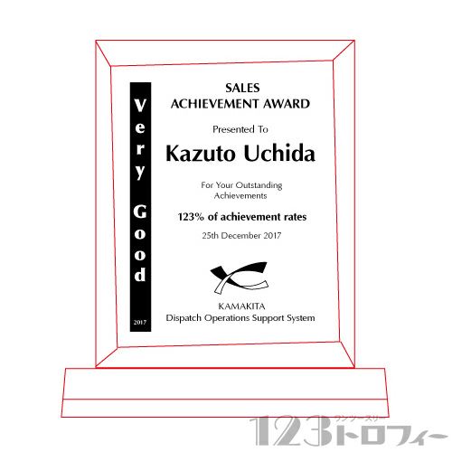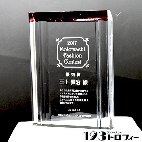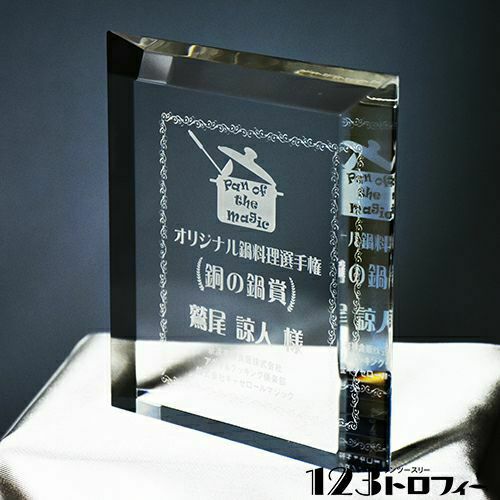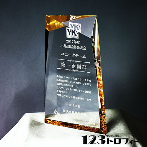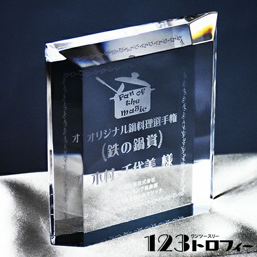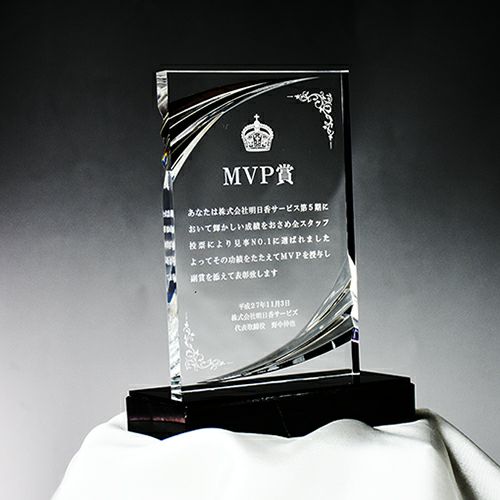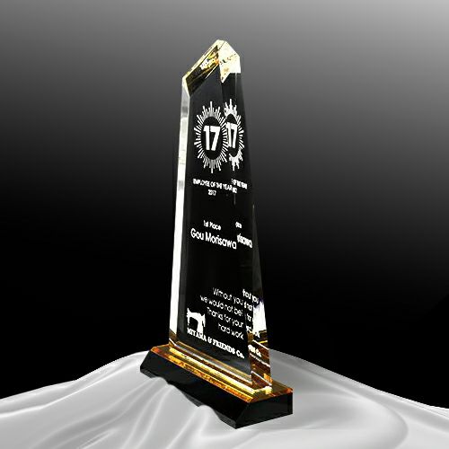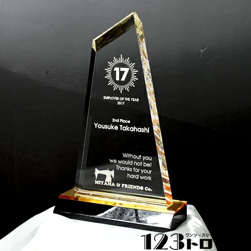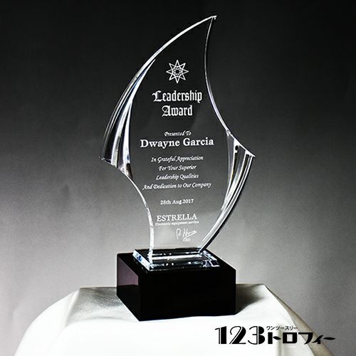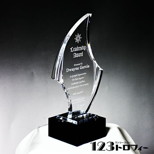 表彰の本場・アメリカから輸入するユニークな形状のアクリルトロフィー。セミオーダーメイド商品で、文字のレーザー彫刻加工は当店で行います。精密なレーザー彫刻で細かいオリジナルデザインや企業ロゴマーク、イベントロゴや名前の彫刻も可能。アクリル製のトロフィーはガラス製よりも軽くて割れにくく安価なため、当店の人気ナンバーワン商品です。