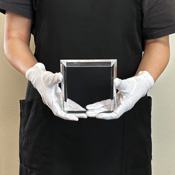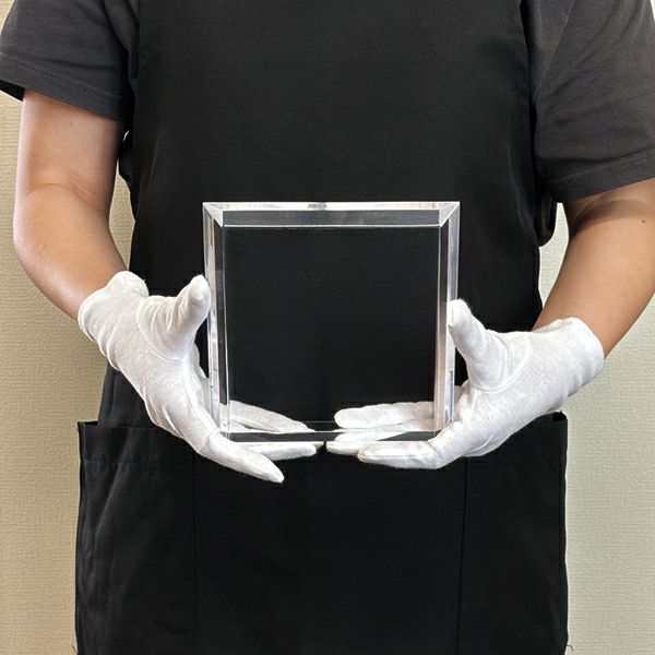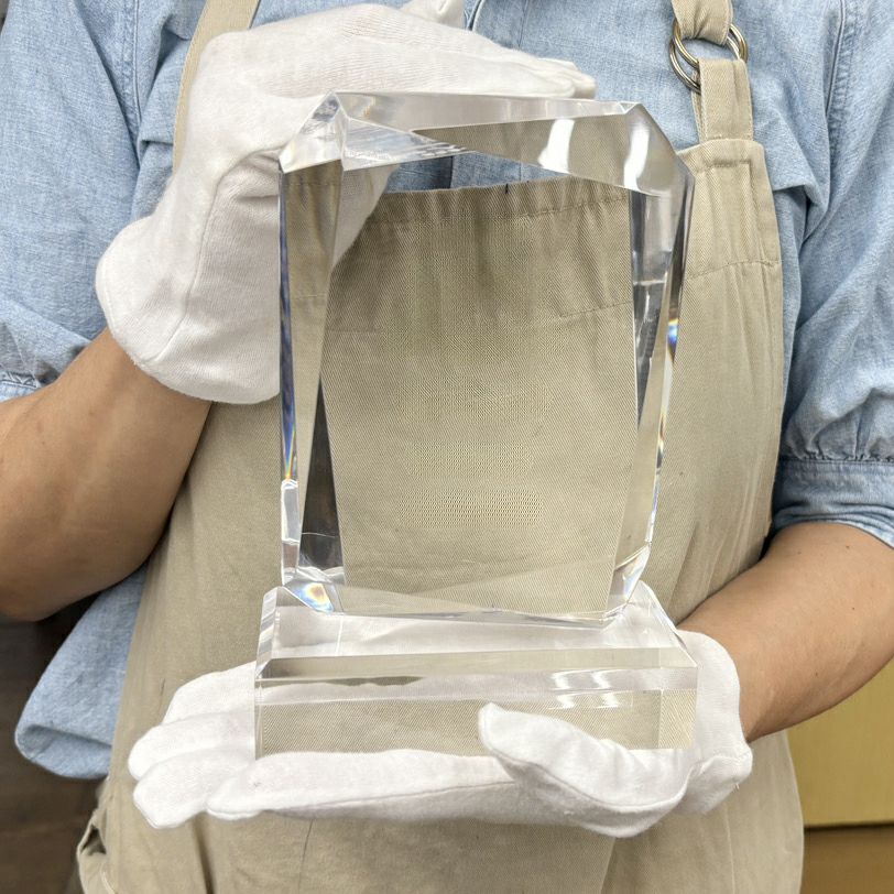 同じ透明なトロフィーとしてクリスタルトロフィー(ガラス製)も取り扱っておりますが、どうしても高価な商品が多いです。しかし、輸入トロフィーはアクリル製のため、比較的安価でお買い求めいただけます。とはいえ、その品質は確かで多くのお客様から喜びの声をいただいており、専用の貼箱に梱包してお届けさせていただいております(白手袋付き)。軽くて丈夫なハイクオリティな透明トロフィーを、ぜひ一度ご利用くださいませ。