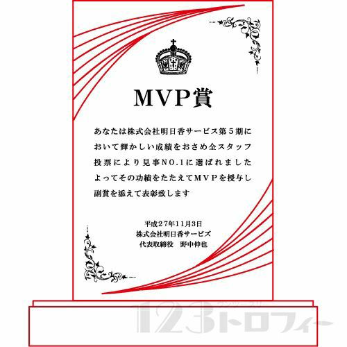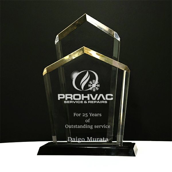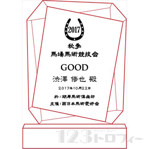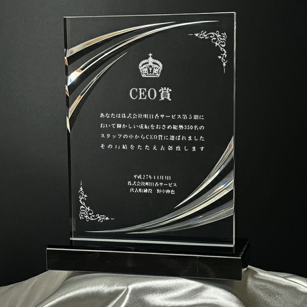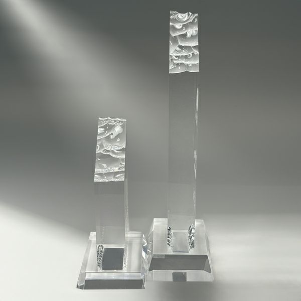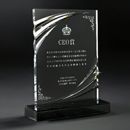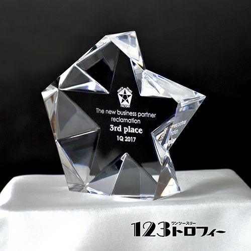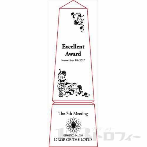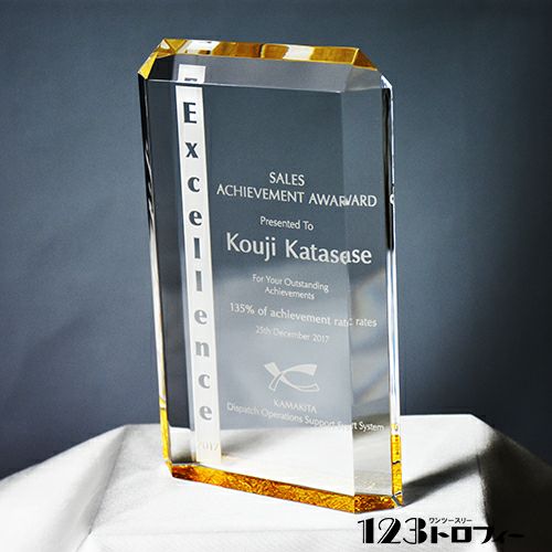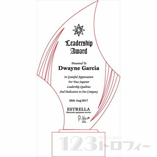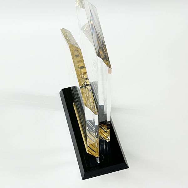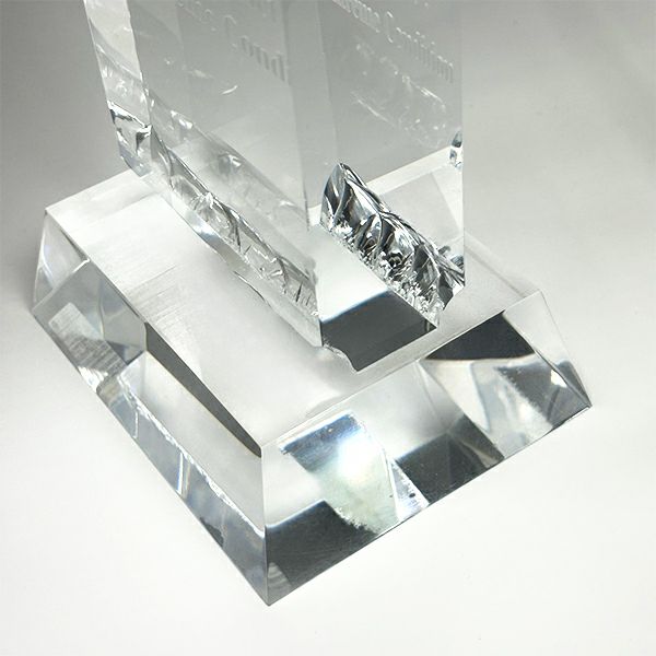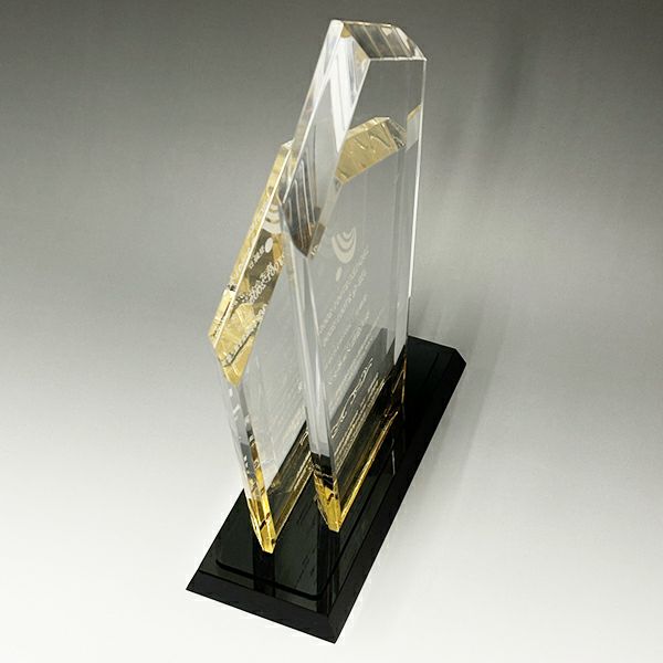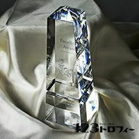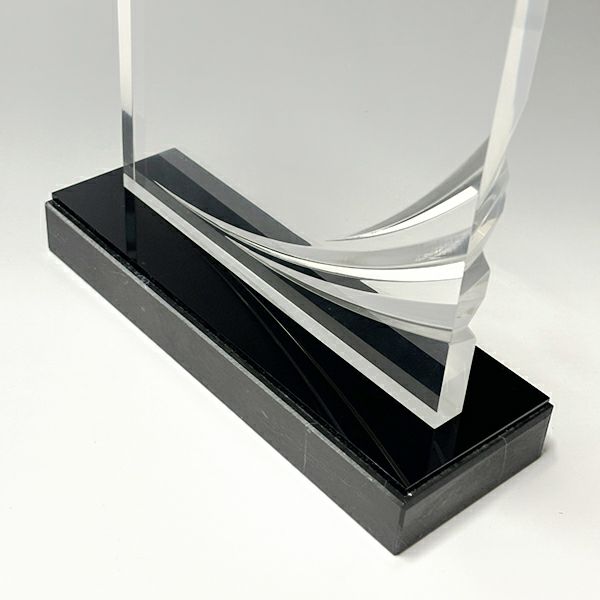 表彰の本場・アメリカから輸入するユニークな形状のアクリルトロフィー。セミオーダーメイド商品で、文字のレーザー彫刻加工は当店で行います。精密なレーザー彫刻で細かいオリジナルデザインや企業ロゴマーク、イベントロゴや名前の彫刻も可能。アクリル製のトロフィーはガラス製よりも軽くて割れにくく安価なため、当店の人気ナンバーワン商品です。
