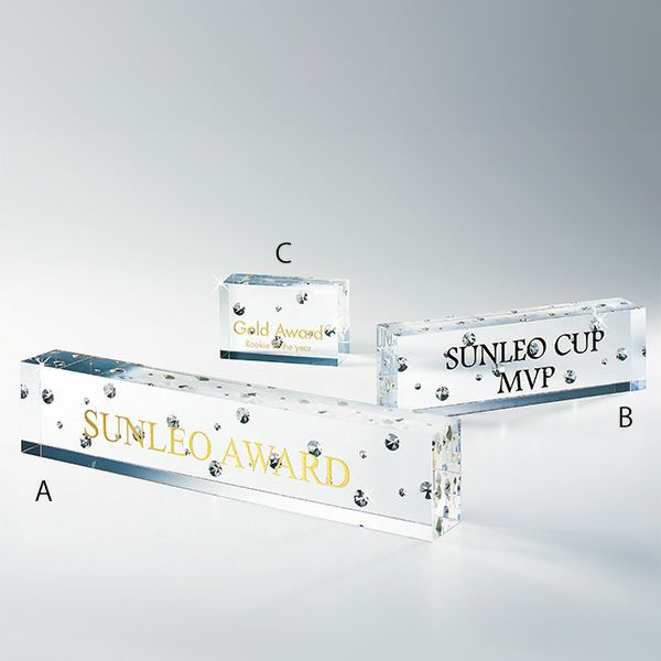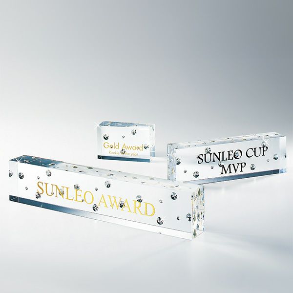 昨今のアワードの定番になりつつある、クリスタル(ガラス製)やアクリル製の透明なトロフィー。法人のお客様からも大人気の商品です。透明なので、光を反射してキラキラ輝く姿が美しく高級感を感じさせます。また、並べて棚に飾っていても上品さが漂い、透けていることで圧迫感を感じさせないのも魅力です。誰もがもらってうれしい、印象に残る華やかなトロフィーです。
