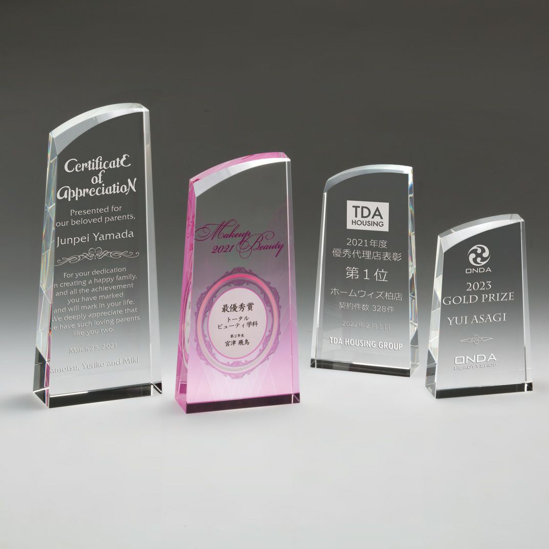 まばゆい輝きで受賞者を照らす高品質でおしゃれなクリスタルトロフィー(クリスタルオーナメント)。オリジナルのデザインをレーザー彫刻orダイレクトプリントし、デザイン料無料でセミオーダーメイドトロフィーを製作できます。