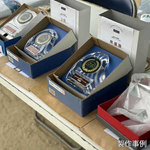 ガラス製ならではの透明感と重厚感のあるクリスタルトロフィーは、表彰用トロフィーの定番として各種大会やコンテストで利用されています。中でもカラーデザイン対応商品は、企業ロゴマークやキャラクターなどのイラストをそのまま表現でき、見た目のおしゃれさからも人気です。デザイン料無料でオリジナルデザインのセミオーダーメイドトロフィーを製作可能。納期がお急ぎでお困りの方も、まずは一度ご相談ください。