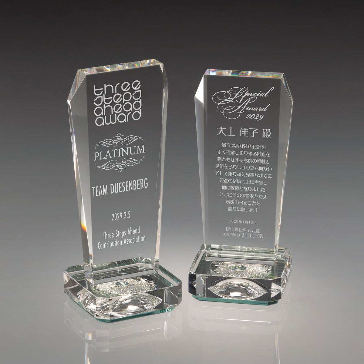 光学ガラスの際立つ透明感ときらめきがまさにクリスタルのようで、その重厚感が魅力です。手に持っても飾っても存在感があり、イベントの格式の高さを表現できます。