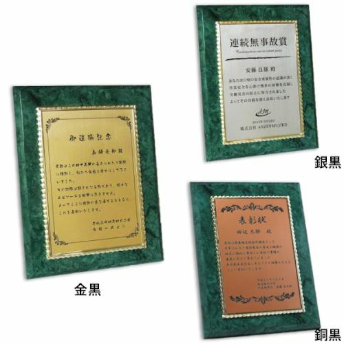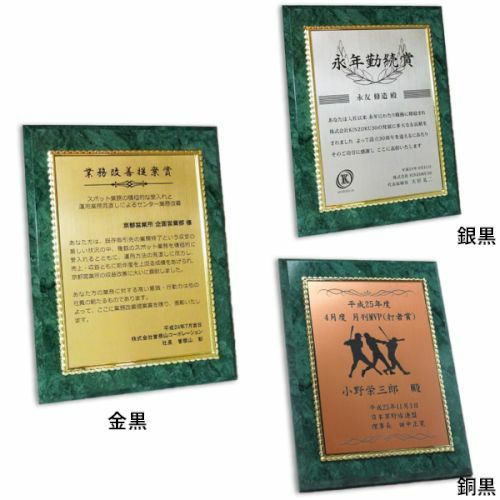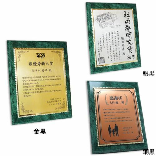 他の画像を見る 短納期対応。デザイン料無料 MDF表彰楯・記念楯 飾枠付グリーンマーブル+銅黒樹脂プレート Sサイズ【オーダーメイドデザイン作成お任せください デザイン保管】 カートに入れる お気に入りに登録する オリジナルデザイン対応 デザイン確認あり 1個〜注文可能 デザイン料無料 当店特別価格 ¥ 7,130 税込 (0)