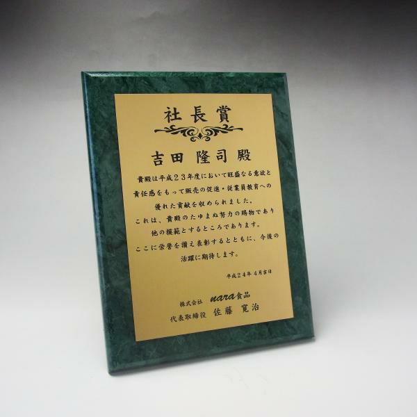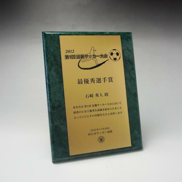 他の画像を見る 金色の樹脂製プレートにデザイン彫刻可能。デザイン料無料 MDF表彰楯・記念楯 グリーンマーブル+金黒樹脂プレート楯 Sサイズ【オーダーメイドデザイン作成お任せください デザイン保管】 カートに入れる お気に入りに登録する オリジナルデザイン対応 デザイン確認あり 1個〜注文可能 デザイン料無料 当店特別価格 ¥ 7,130 税込 (0)