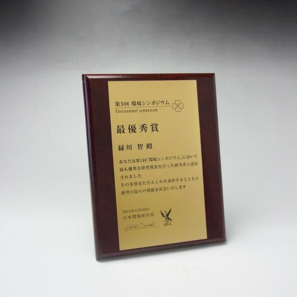 ロゴマークや文章を自由にデザイン可能な表彰楯 MDF表彰楯・記念楯 飾枠付ダークオーク+樹脂プレート Sサイズ【オーダーメイドデザイン作成お任せください デザイン保管】