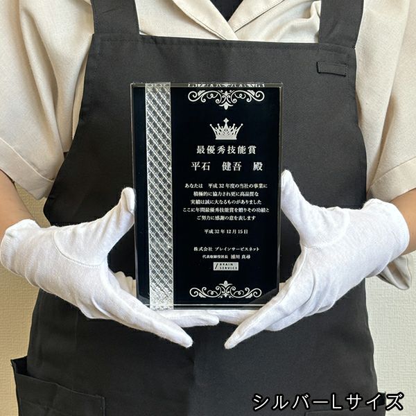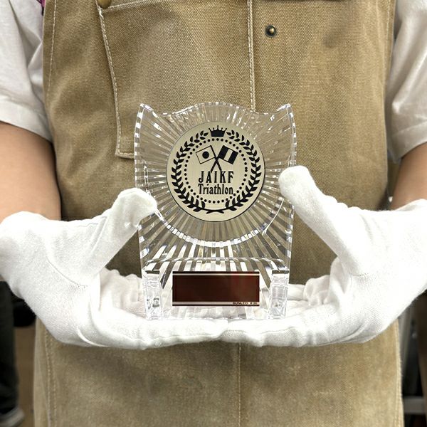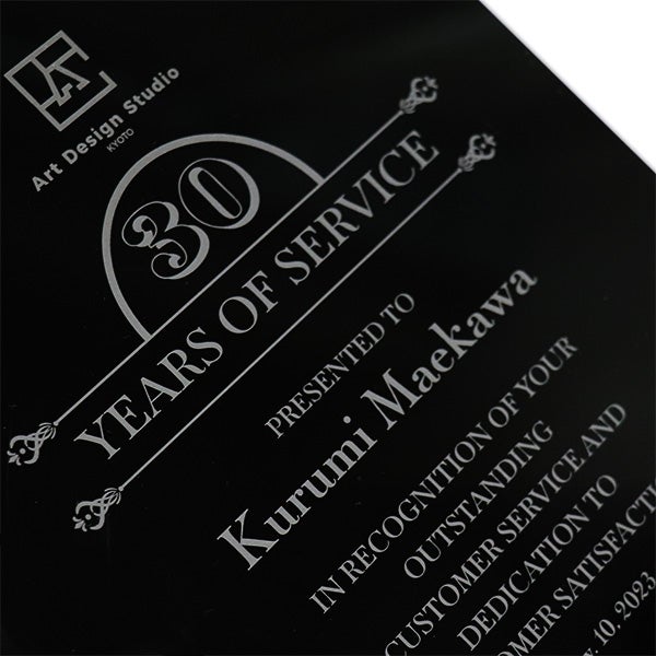 永年勤続表彰や取引様への感謝楯など法人利用として、コンテスト・コンクールなど文化イベントの表彰記念品として幅広くご利用いただいております。一般的なノセコ(ワシなどの金属のモチーフ)が乗った表彰楯はもちろん、板の全面にレーザー彫刻ができるオーダーメイド表彰楯やミラー素材の楯、アクリルプレートとの組み合わせでより高級感を演出できる楯など、豊富な品揃えの中からお選びいただけます。1962年に創業以来、自社工場での名入れ加工の実績を重ねてきた確かな技術で、丁寧に彫刻を施します。