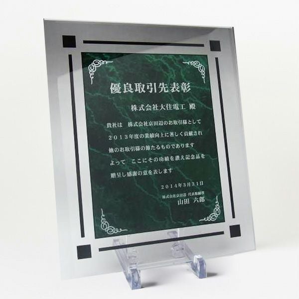 他の画像を見る オリジナルデザイン対応 デザイン確認あり 1個〜注文可能 デザイン料無料 表彰状や感謝状、社内表彰や学会表彰に人気 MDF表彰楯・記念楯 グリーンマーブル+樹脂プレート楯 スクエア Mサイズ【オーダーメイドデザイン作成お任せください デザイン保管】 カートに入れる お気に入りに登録する (0) 当店特別価格 ¥ 7,639 税込
