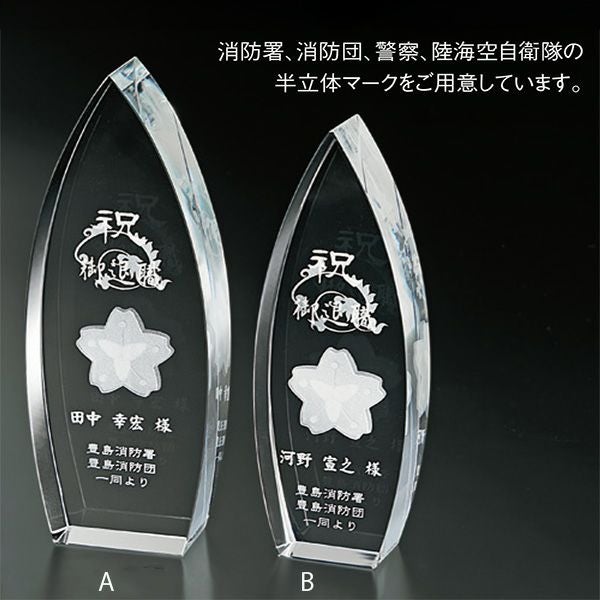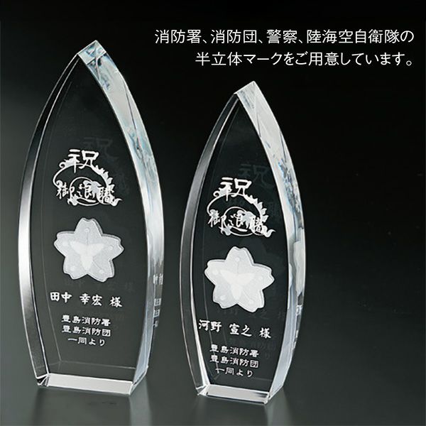 他の画像を見る オリジナルデザイン対応 デザイン確認あり 1個〜注文可能 デザイン料無料 消防・警察・陸海空自衛隊の半立体マーク付きクリスタルトロフィー 光学ガラス製トロフィー SB-218A 高さ200mm 消防・消防団表彰 退官記念品 退団記念品 カートに入れる お気に入りに登録する (0) 当店特別価格 ¥ 20,900 税込